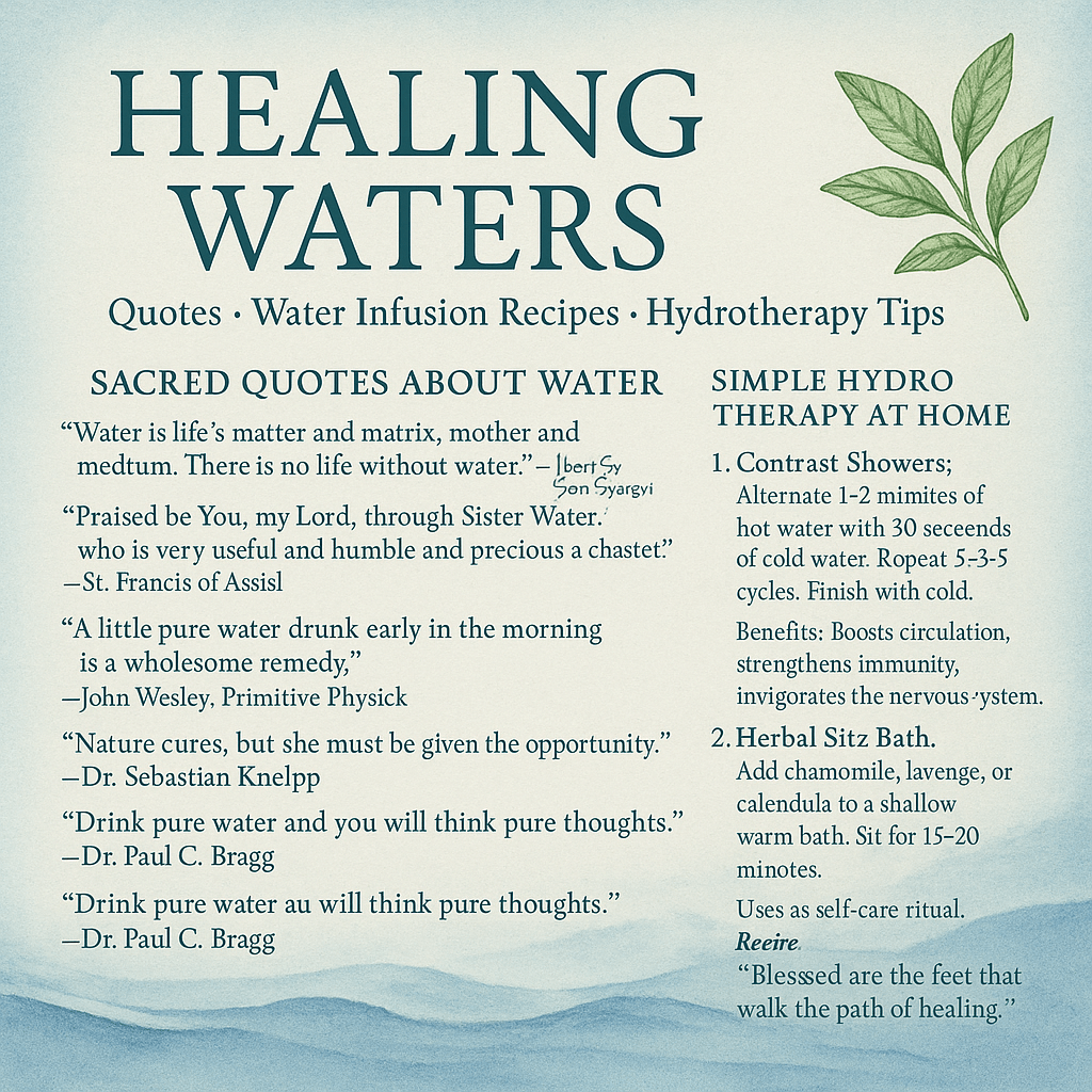 Today, amidst chronic illness, environmental stress, and an often over-medicated society, a return to the healing traditions of water may be one of the most revolutionary acts of all. Cold compresses, warm baths, internal cleansing, herbal infusions, and prayerful immersion can serve as gentle tools of restoration.